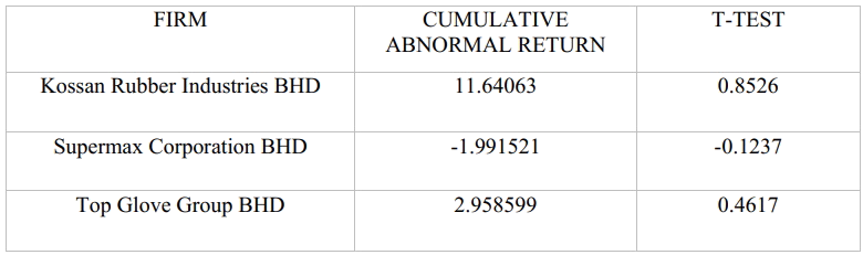 The event study methodology that was conducted on the glove stocks obtained the expected results for 3 out of the 5 firms that were included in our study during the event window (0,75). This effectively means that the announcement made by the WHO indeed had an impact on the stock returns for Top Glove, Supermax and Hartalega. Although the “event” in our study is the announcement by the WHO, the abnormal returns and the high price rises were not due to the announcement alone as the announcement is only used as a specific date that the COVID-19 pandemic started taking the world by storm.