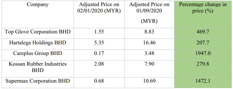 However, not all is gloom and doom as there are those who have benefited a great deal due to the pandemic, namely the Malaysian glove companies. Top Glove, which is the largest glove company in the world, has seen its share price grow nearly six times fold year-to-September 2020 during the pandemic. Top Glove is not the only company to see such large numbers as other Malaysian glove counters have also seen a boom in share prices as seen in the table below.