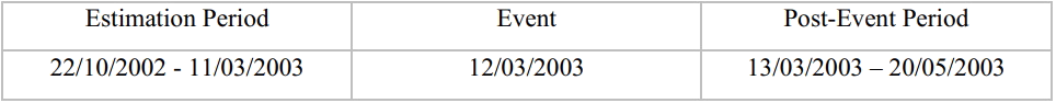 In order to obtain the abnormal returns of the firms we are analysing, the expected returns of the firm (if the event had not occurred) would need to be calculated as well. Having said that, we will also use 150 trading days prior to our event in order to obtain the estimates used to compute the abnormal returns in the event window. The timeline for our analysis is as shown below: