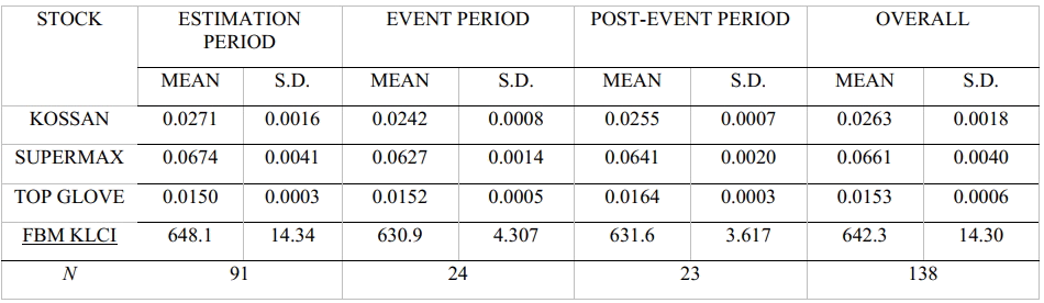 Table 2 presents the summary statistics of the stock prices of the Malaysian glove firms and the market index during the different periods of our study on the COVID-19 pandemic. It is evident from all 5 firms in Table 1 that the pandemic has had a significant effect on its stock prices. All 5 firms saw a large increase in its average stock price across both periods. Careplus Group Bhd. which is the smallest firm amongst the five in terms of market capitalisation, saw the biggest change in its average stock price of approximately 322% increase from the estimation period to the event period followed by another 320% increase in the post-event period. An important statistic to note from the table would be the average of the market index (FBM KLCI) which saw a 10% fall during the event period. This indicates that the average price of the other firms saw a significant fall in its prices on average. This could suggest that the abnormal returns of the glove stocks during the event period are high as the market is showing negative returns while the glove stock prices are increasing rapidly. In the post-event period however, the market index saw a significant improvement which indicates its recovery from the pandemic. This could mean that the abnormal returns of the stocks may not be apparent in the post-event period as the index representing all the other firms look as if they are recovering and generating positive returns.