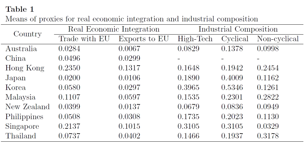 See Table 1 for the means of proxies for real economic integration and industrial composition.