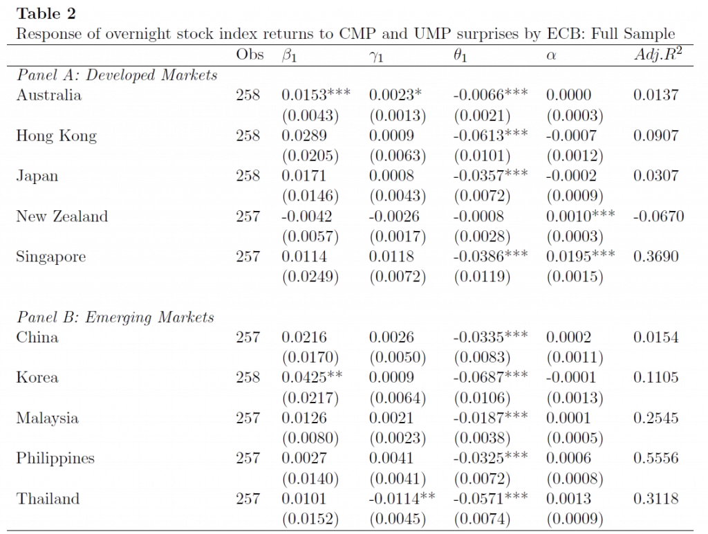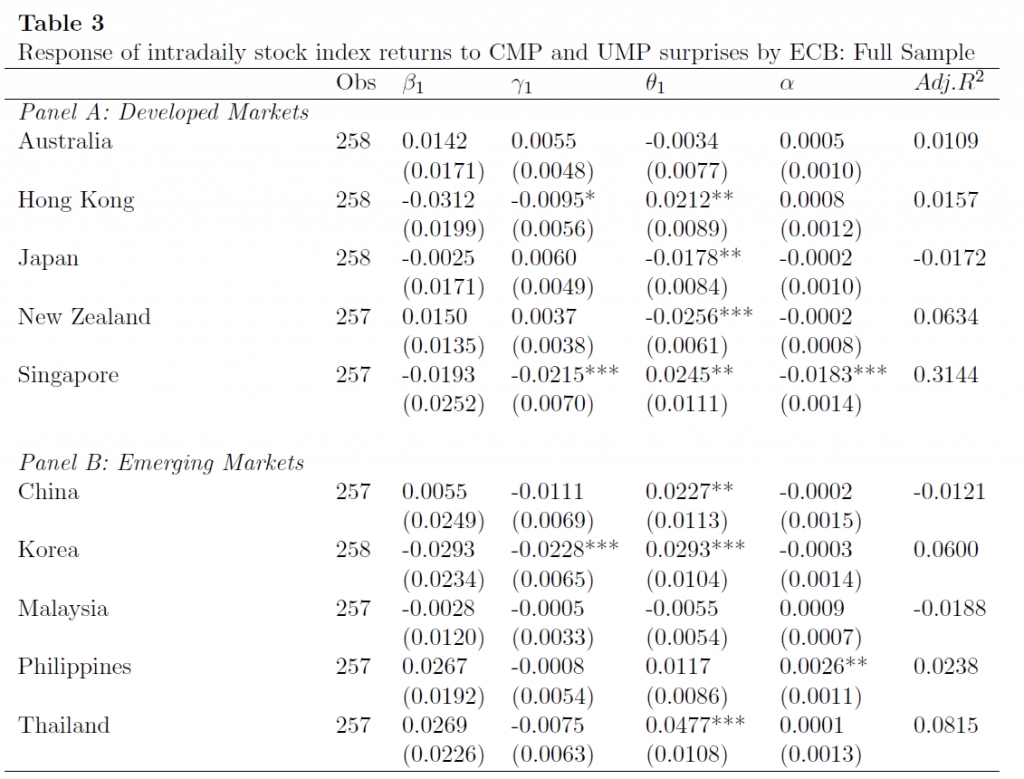 As a benchmark for estimating the immediate reaction of Asia-Pacific stock markets to CMP and UMP actions by ECB, we begin our empirical investigation by running the following full-sample linear regression for each country, without distinguishing between sub-sample periods (GFC or COVID-19):
