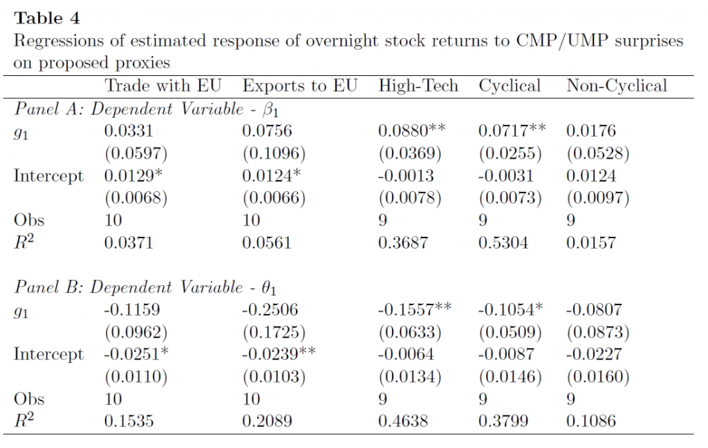 To validate H1b and explore cross-country variation in responses to CMP and UMP surprises, we ran the following and reported the cross-sectional regression results in Table 4:
