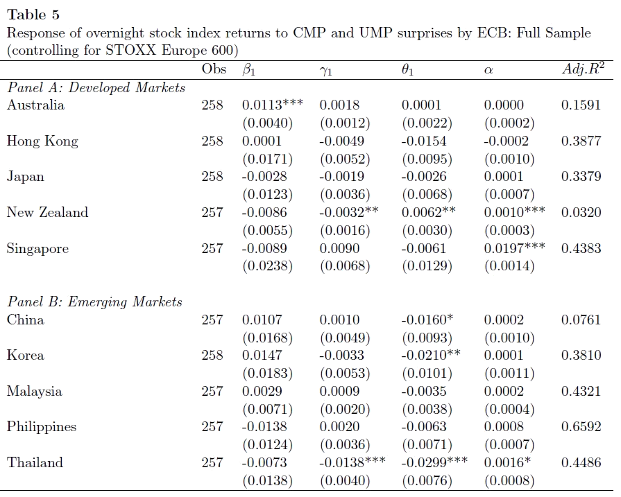 Revisiting the possibility of international stock market co-movement, Table 5 similarly reported OLS estimates of Eq. (1), but with the inclusion of STOXX Europe 600 as an additional control variable. We found that both the significance level and magnitude of overnight stock market responses to monetary policy surprises substantially reduced upon the new variable’s insertion into our specifications, in comparison to the same set of estimated parameters in Table 210The coefficients of the European index are highly significant and positive in all cases. Results are available upon request.. This reinforces the international transmission effects among major stock markets (Hsin, 2004), and echoes Wang and Zhu’s (2013) recent documentation of the role of equity price co-movement in muting the reaction of foreign stock markets to U.S. monetary policy surprises. However, considering the drastic improvement in the adjusted R-squared across all studied countries, we proceeded to control for STOXX Europe 600 when estimating Eqs. (2) and (3).