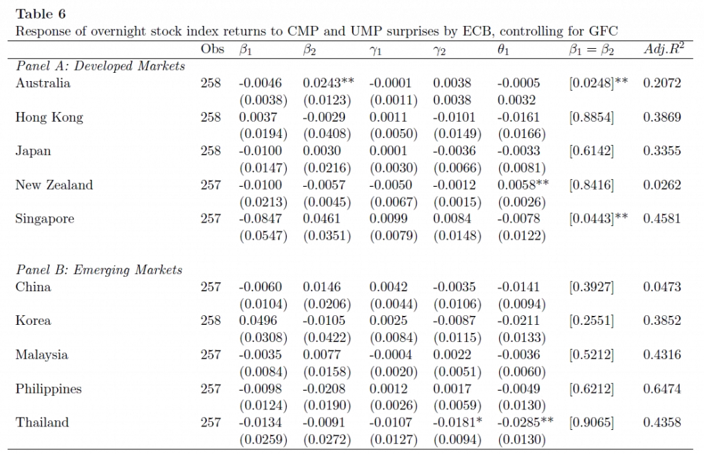 Notes: This table reports OLS estimates of Eq. (1) over ECB announcement dates, regressing overnight (R0) stock returns on the relevant explanatory variables. Euro Area, United States and domestic macroeconomic announcements, the GFC dummy and the COVID-19 dummy are included as control variables. Sample period is January 2001 – January 2021. Obs indicates the number of relevant ECB announcements for each Asia-Pacific country. Panel A includes developed market countries: Australia, Hong Kong, Japan, New Zealand and Singapore. Panel B includes emerging market countries: China, Korea, Malaysia, Philippines and Thailand. Standard errors are below coefficient estimates in parentheses.